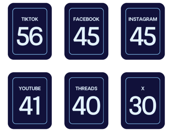 TikTok, YouTube, X, Facebook, Instagram, and Threads were evaluated on multiple indicators, including: