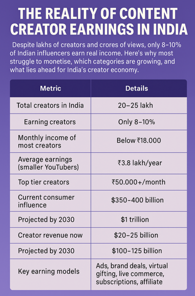 Despite lakhs of creators and crores of views, only 8–10% of Indian influencers earn a real income. Here's why most struggle to monetise, which categories are growing, and what lies ahead for India's