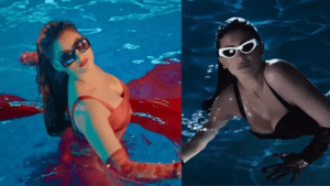Urvashi shared a video of herself from a brand shoot and in the video, we could see Urvashi’s daring outfit featured a plunging deep neckline that perfectly flaunted her curvaceous figure. The swimsuit was elevated with a long trail, net hand gloves, and a wet hair look, adding an extra touch of glamour. With her striking red lips and the allure of the eyewear she was promoting, Urvashi exuded sheer sensuousness and hotness